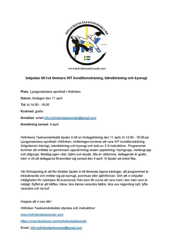 Höllvikens taekwondoklubb bjuder in till ett gemensamt träningspass den 11 april. Högintensiv konditionsträning, teknikträning och kyorugi. Deadline att anmäla sig är den 4 april.